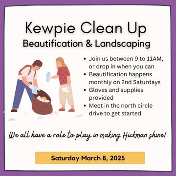 On the second Saturday of each month we host a Kewpie Clean Up on campus. Please join Hickman PTSA volunteers to help make campus shine! All are welcome to meet up with us at the north circle drive for check-in. All supplies--disposable gloves and trash bags--are provided.